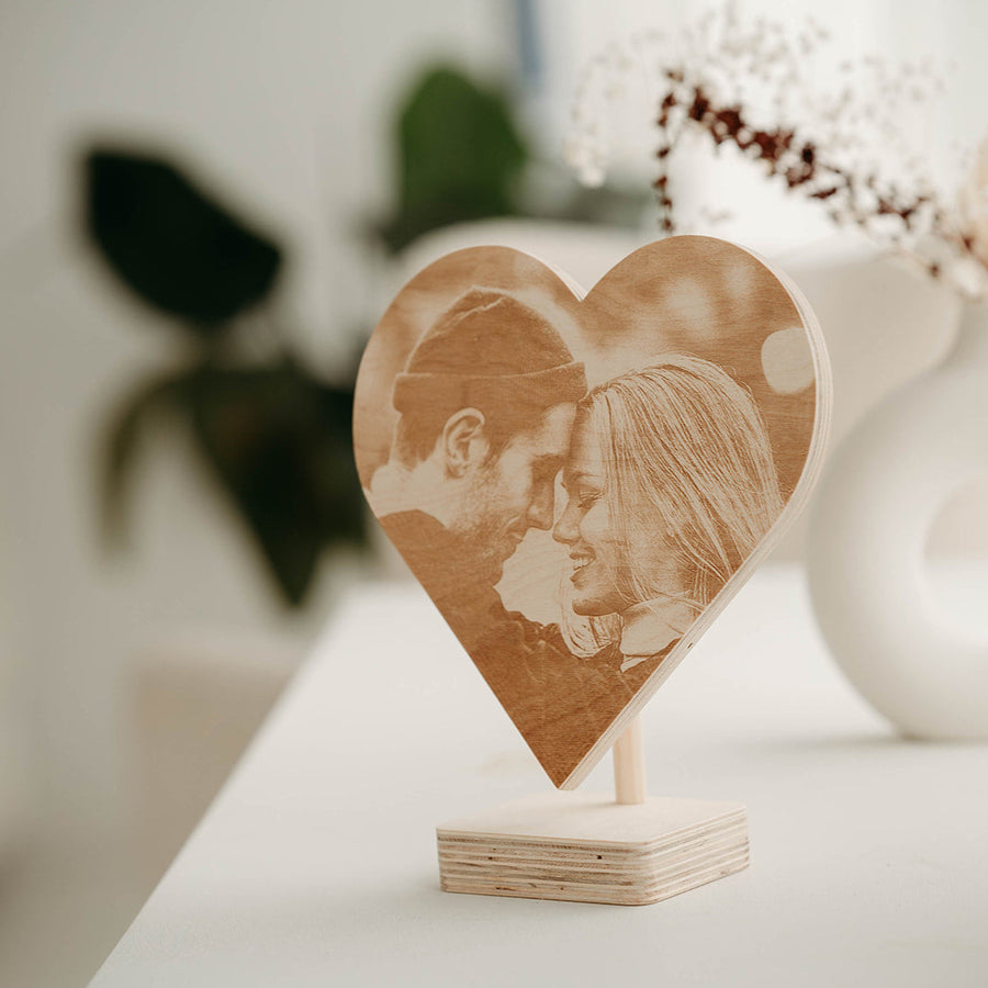 Een luxe foto gebrand op hout op een dikkere robuuste plaat maar dan in speciale vorm. Om neer te zetten met een luxe houten voet.