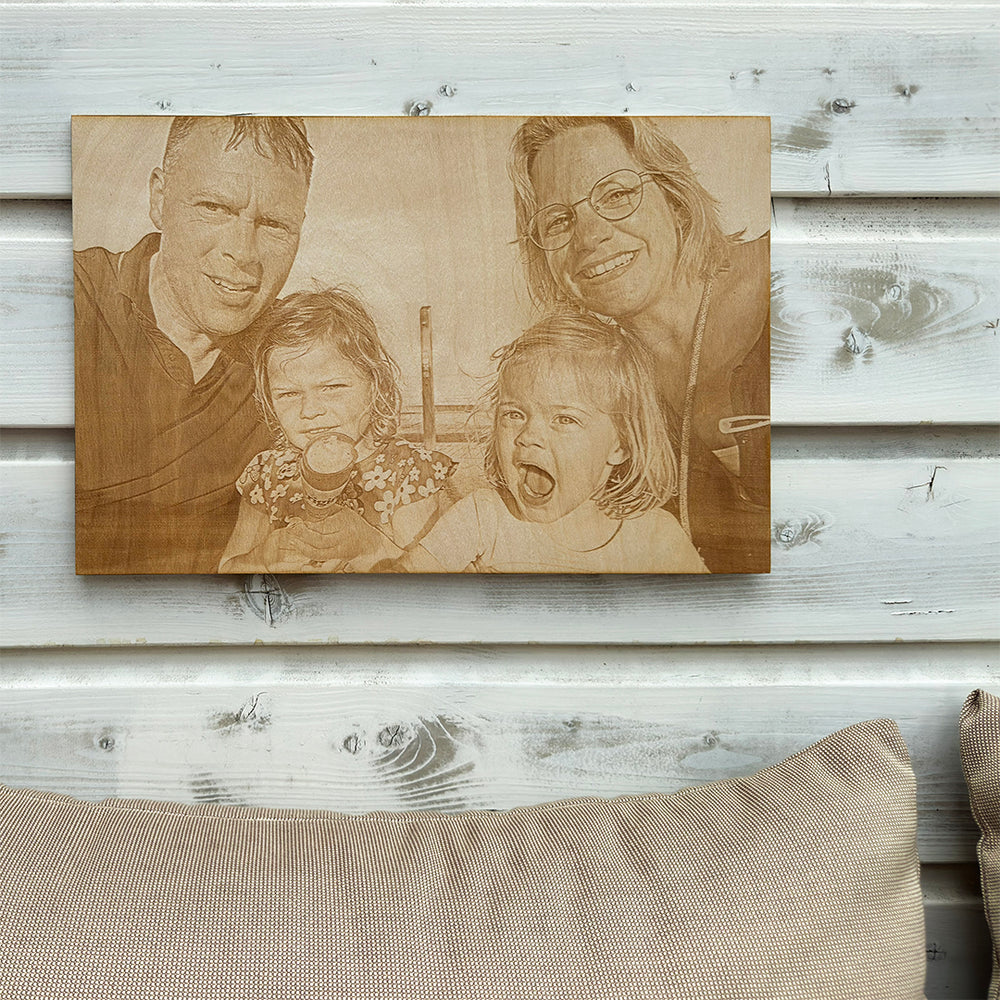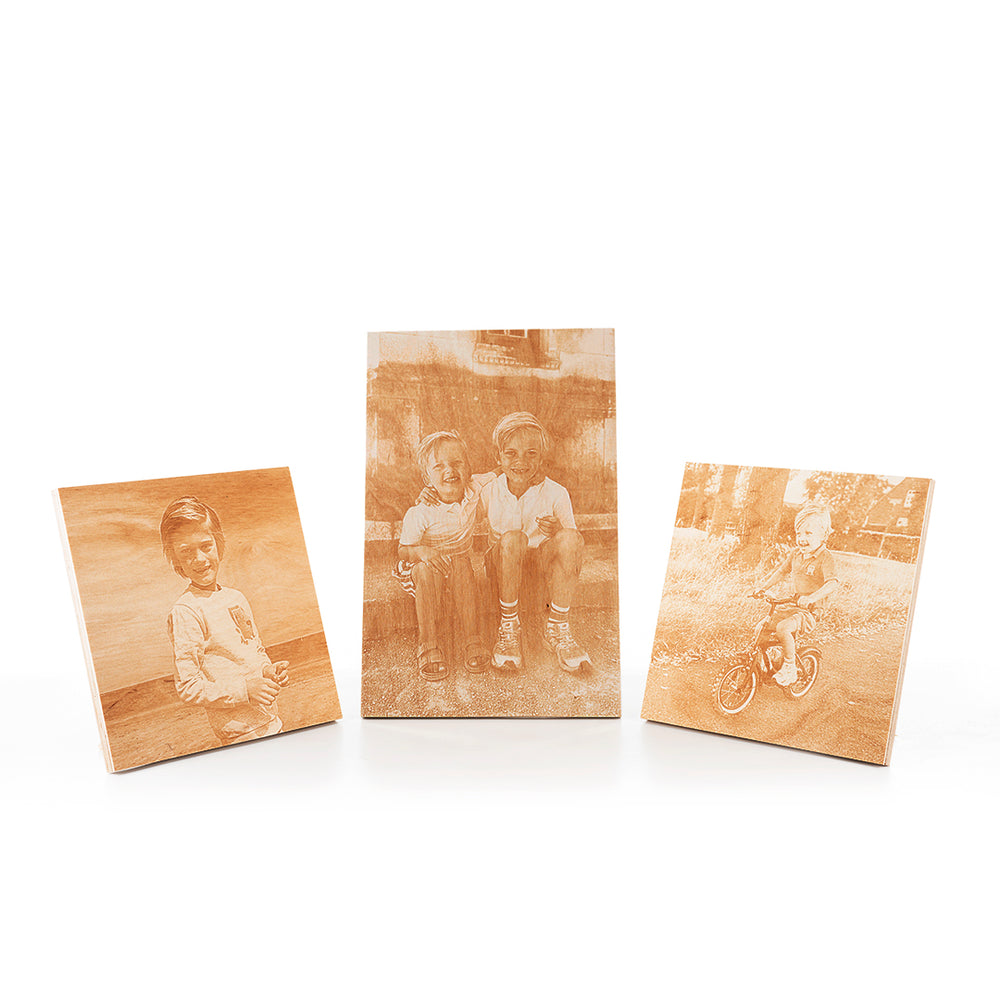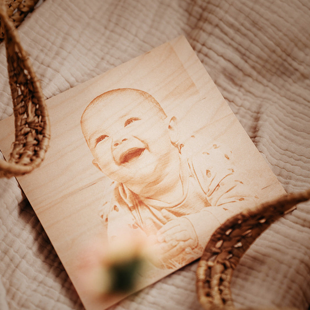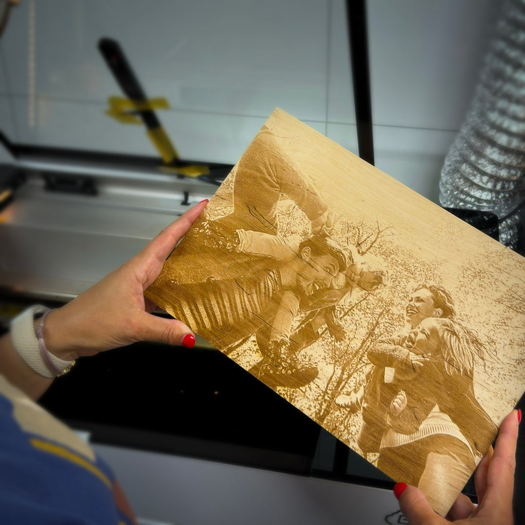 Met onze lasergraveer-techniek branden we foto's en afbeeldingen met grote precisie op hout. Zelfs de kleinste details worden zichtbaar, waardoor de afbeelding echt tot leven komt.